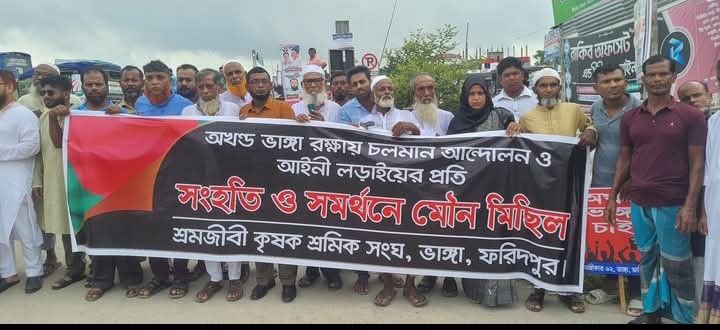 শ্রমজীবি কৃষক শ্রমিক সংঘের উদ্যোগে এবং এসএসসি-৯২ ব্যাচের স্বেচ্ছাসেবী সংগঠন অঙ্গীকার-৯২ ও মানবকল্যাণ ফাউন্ডেশন-এর সহযোগিতায় অখণ্ড ভাঙ্গা রক্ষার দাবিতে মৌন মিছিল ও প্রতিবাদ সমাবেশ অনুষ্ঠিত হয়েছে।