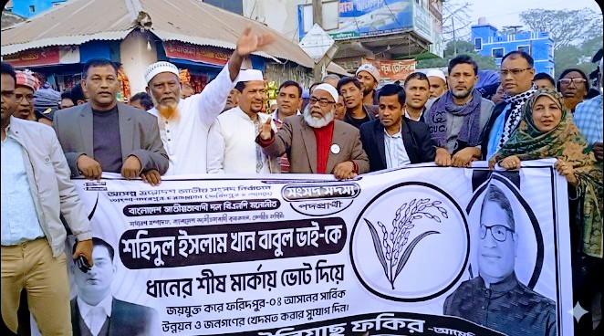 ফরিদপুর-৪ আসনের নির্বাচনী আমেজ এখন তুঙ্গে। বিশেষ করে ভাঙ্গা উপজেলার আজিমনগর ইউনিয়নে বাংলাদেশ জাতীয়তাবাদী দল (বিএনপি) মনোনীত প্রার্থী শহিদুল ইসলাম খান বাবুলের সমর্থনে বইছে জোরালো নির্বাচনী হাওয়া। এই প্রচারণায় অগ্রণী ভূমিকা পালন করছেন বিশিষ্ট সমাজসেবক ও আমেরিকা প্রবাসী নেতা **ইলিয়াছ ফকির**। তাঁর বলিষ্ঠ নেতৃত্ব ও পৃষ্ঠপোষকতায় শিমুল বাজার এলাকায় এক বিশাল গণমিছিল ও শোডাউন অনুষ্ঠিত হয়েছে।